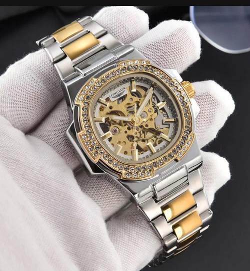 This timepiece features a visible skeletonised automatic calibre, showcasing the precision within. Expertly engineered, it offers a view into the heart of mechanical excellence, designed for those who cherish style and substance.